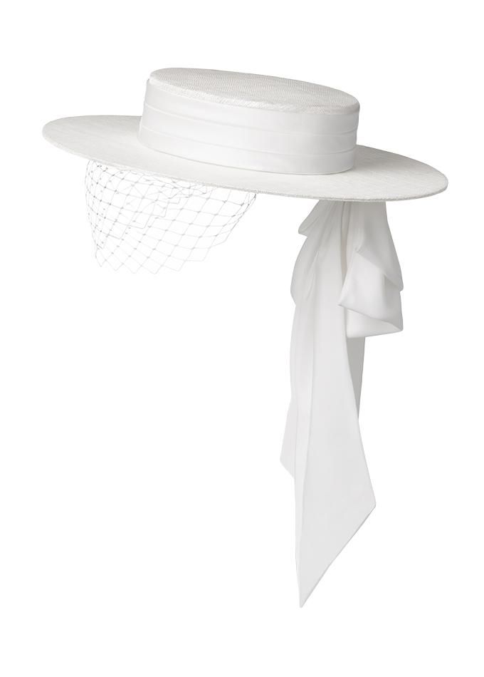 Chapeau Canotier de Mariage Blanc à Large Bord et Voilette